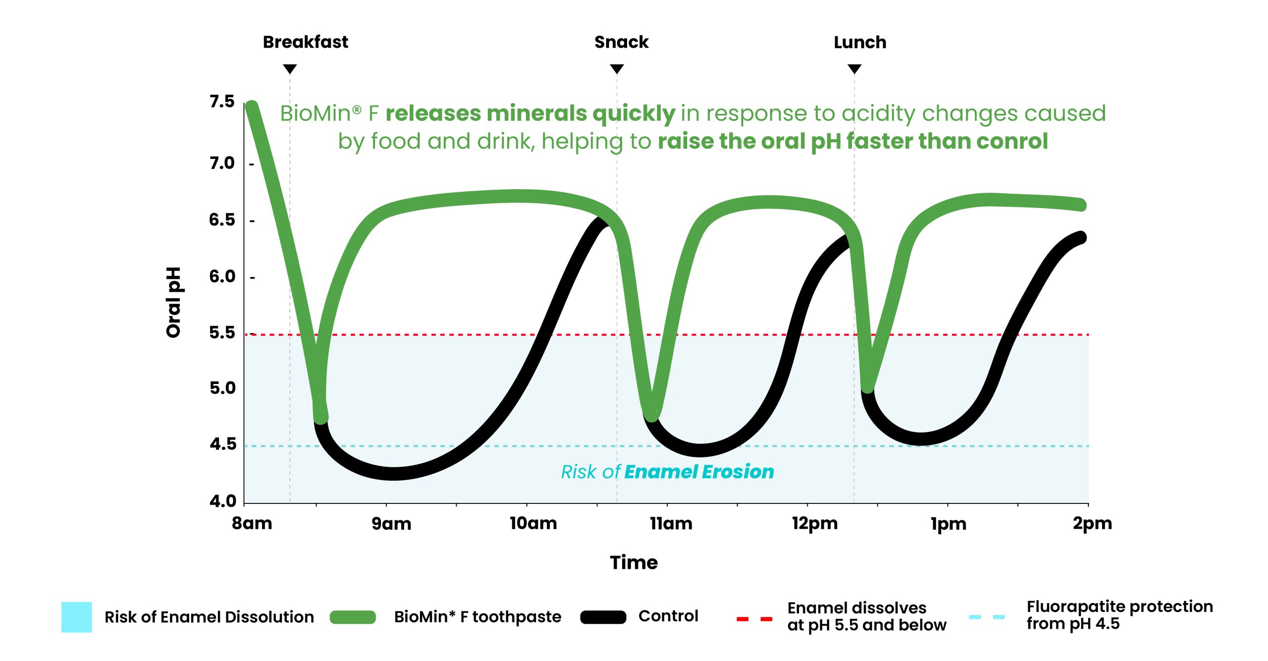 BioMin® F is the only toothpaste that continuously defends by releasing minerals in response to changes in acidity caused by food and drink
