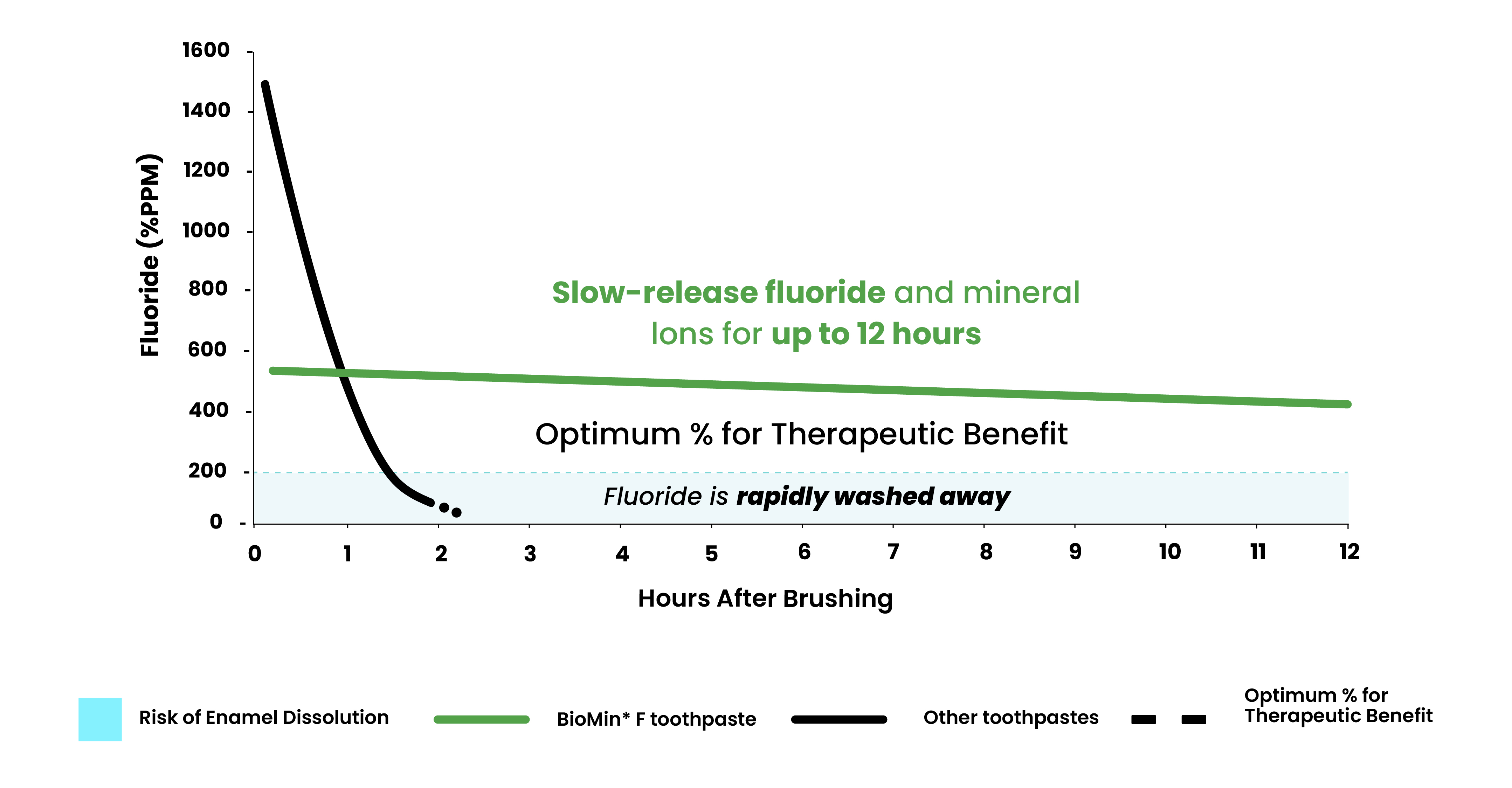 Studies show BioMin® F delivers superior performance with slow-release fluoride and higher phosphate, despite using 60% less fluoride than other toothpastes.